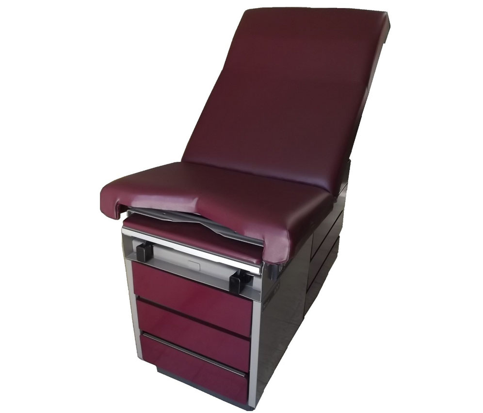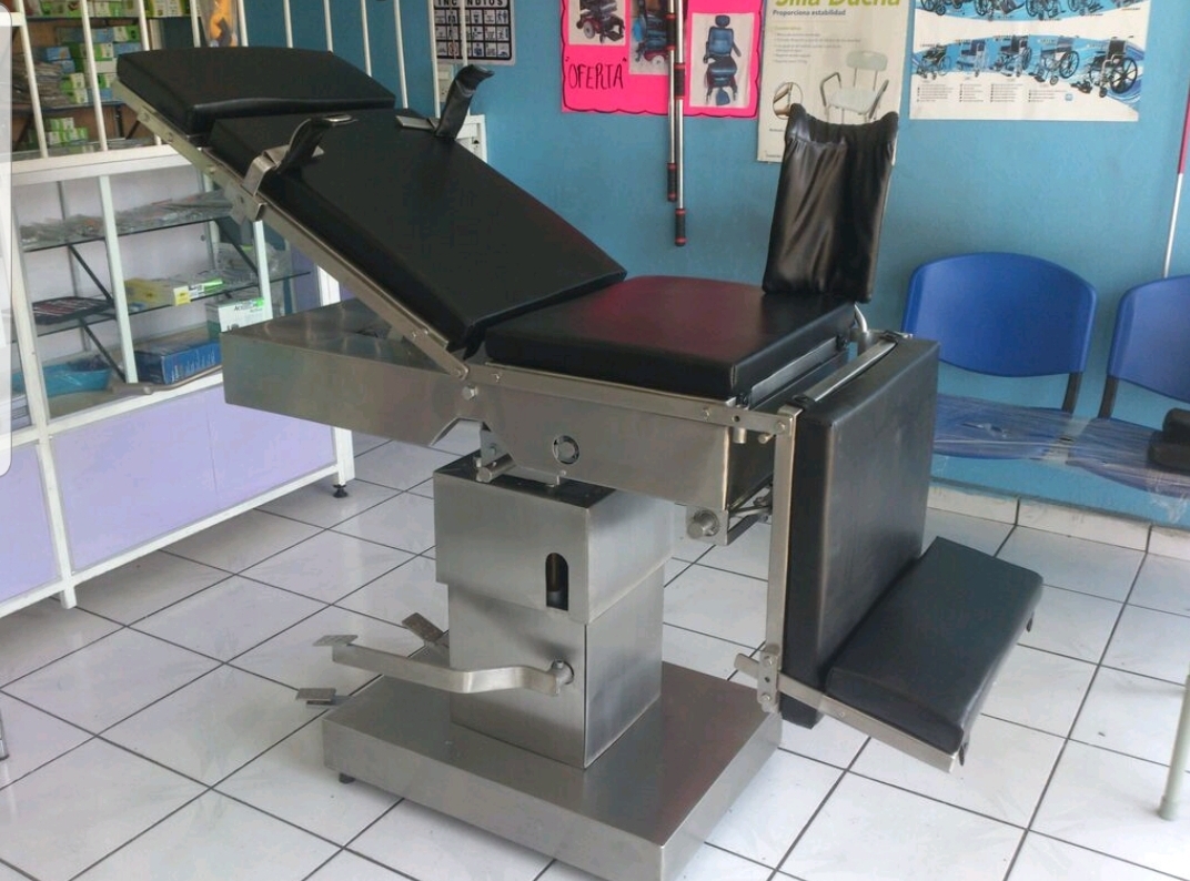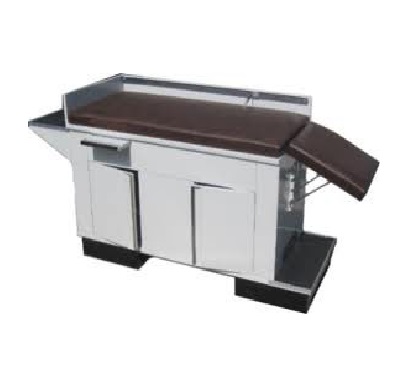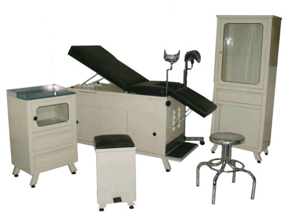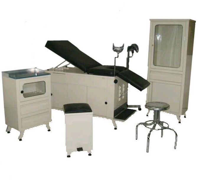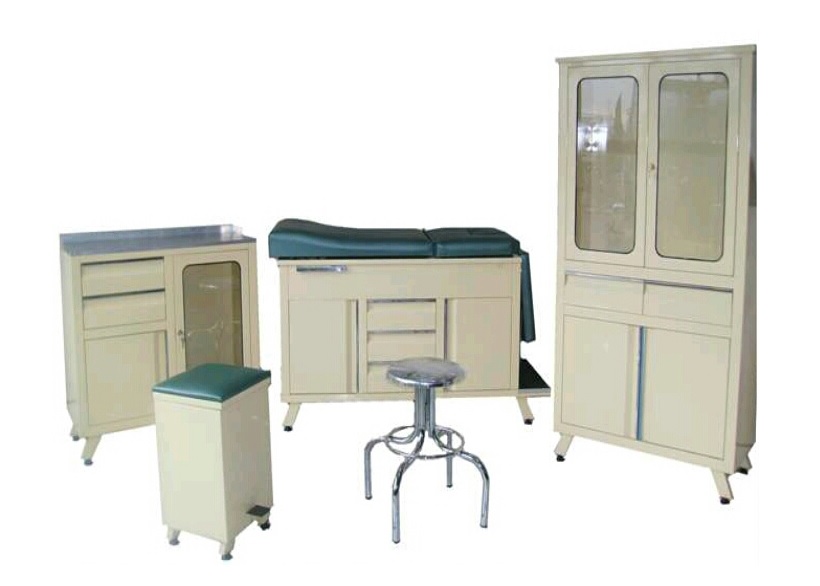Juego de 5 piezas, mesa de exploración, vitrina doble, gabinete doble, banco giratorio, bote basurero.