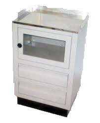 Juego modelo Leo de 5 piezas, mesa de exploración modelo Futuro, vitrina sencilla, gabinete sencillo, banco giratorio, bote basurero.
